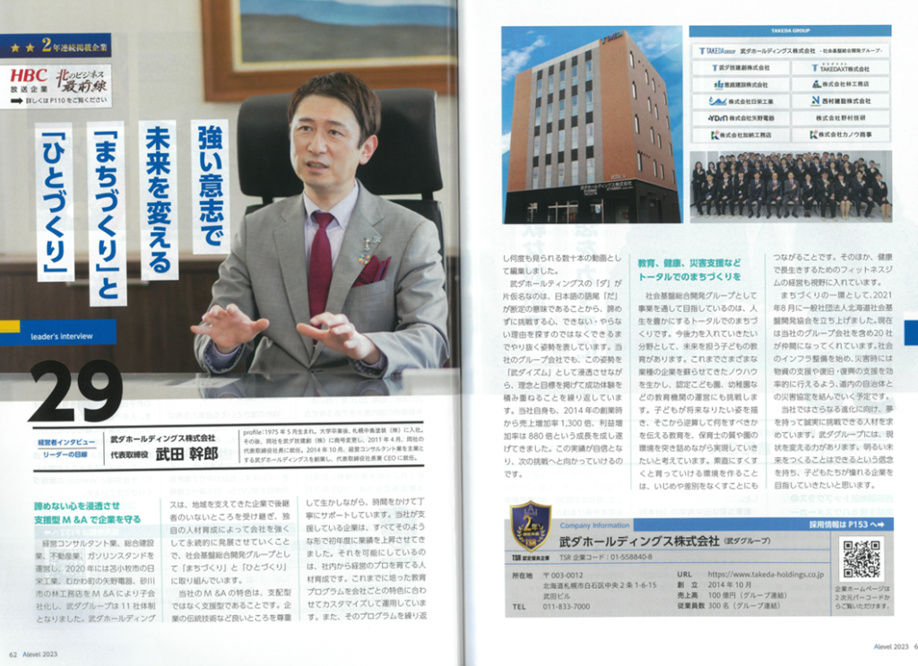 2022年5月号の北海道の優良企業情報誌エラベルに武ダホールディングス㈱代表取締役社長兼CEO武田幹郎の経営者インタビュー記事が掲載されました。