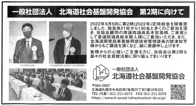 2022年9月28日発行の北海道建設新聞に、武ダホールディングスが正会員である一般社団法人北海道社会基盤開発協会の広告記事が掲載されました。