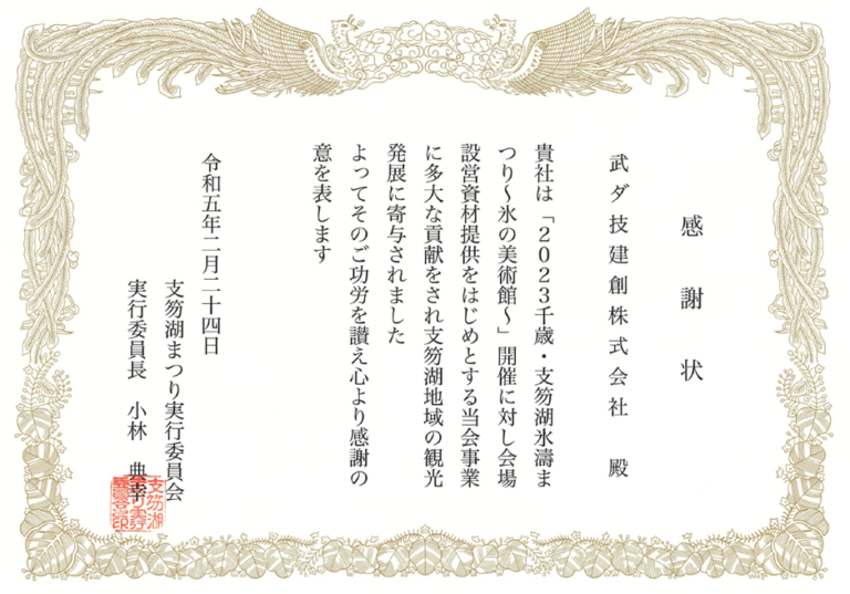 グループ会社である武ダ技建創は、2023年1月28日から2月23日にわたり開催された「2023千歳・支笏湖氷濤まつり~氷の美術館~」の設営準備協力を行い、それに対して千歳・支笏湖氷濤まつり実行委員会から感謝状をいただきました。