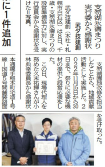 グループ会社である武ダ技建創が千歳・支笏湖氷濤まつり実行委員会から感謝状をいただきました