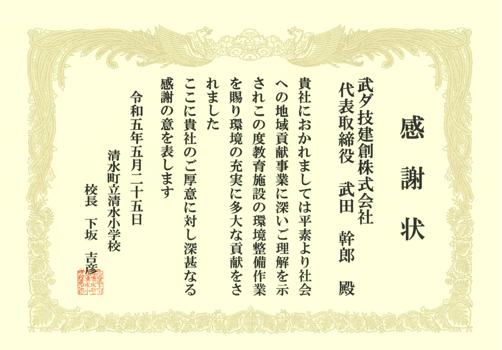グループ会社の武ダ技建創が2023年5月に清水町立清水小学校にてボランティア活動を行い、教育施設の環境整備に貢献したとして感謝状を頂きました。