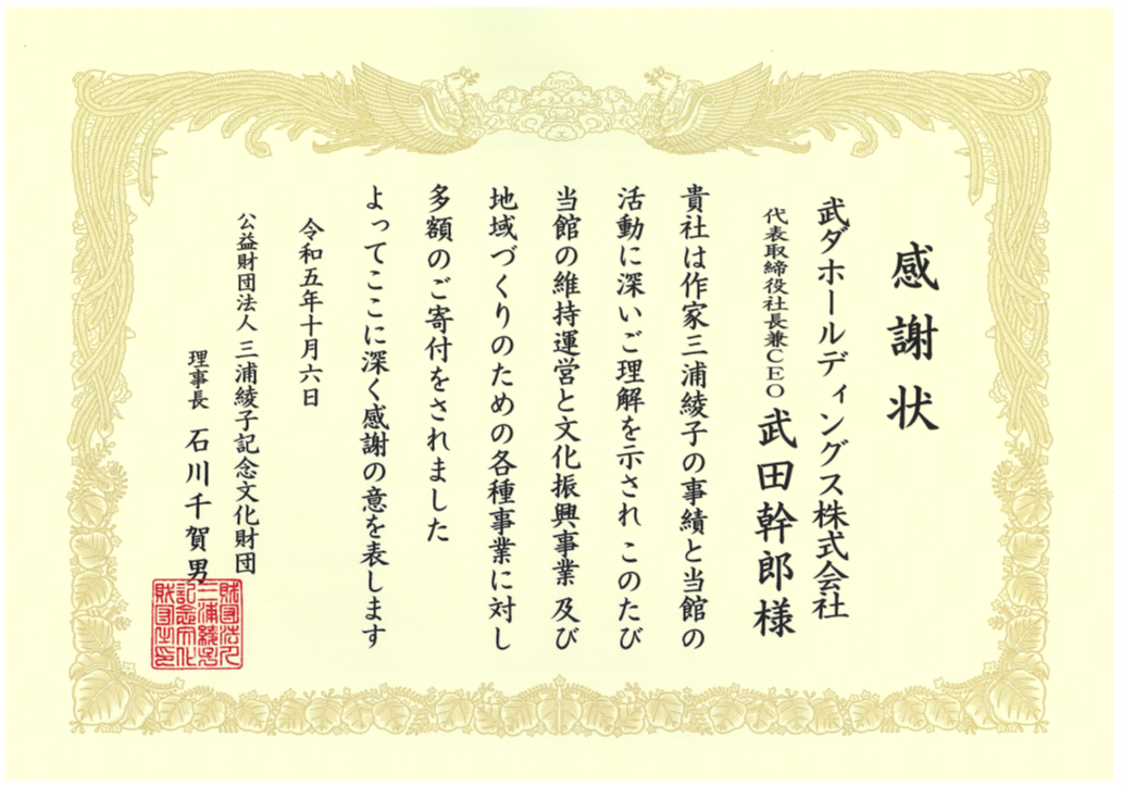 武ダホールディングスが三浦綾子記念文学館に寄付を行い、三浦綾子記念文学館の維持運営と文化振興事業及び地域づくりのための各種事業に対し、貢献したとして感謝状を頂きました。