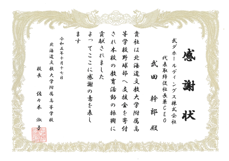 武ダホールディングスが北海道文教大学付属高等学校野球部に寄付を行い、教育活動の振興に貢献したとして感謝状を頂きました。