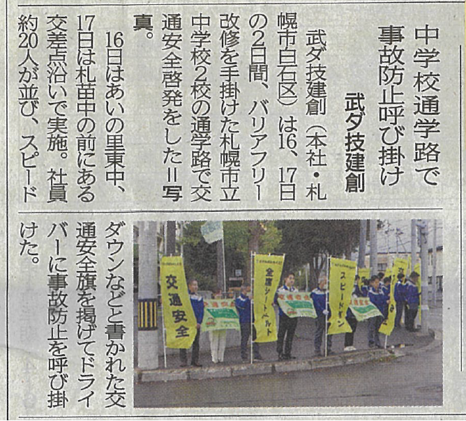 グループ会社の武ダ技建創が中学校通学路で事故防止の呼びかけを行いました