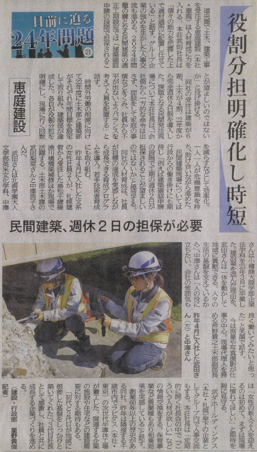 グループ会社の恵庭建設の働き方と人財育成に関する取り組みが北海道建設新聞で紹介されました。