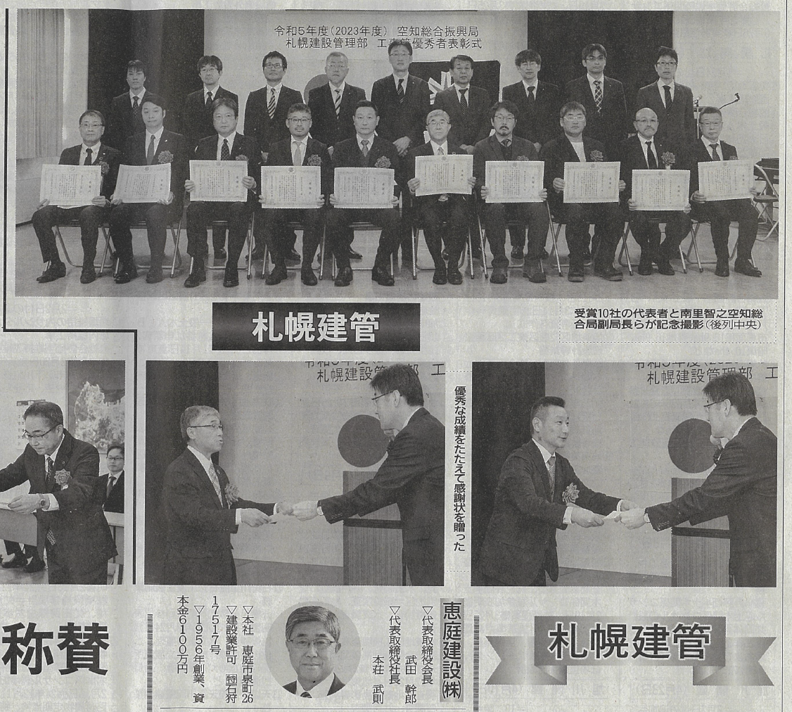 グループ会社の恵庭建設が工事優良企業として空知総合振興局札幌建設管理部から表彰されました。