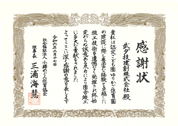 2024年2月、グループ会社の武ダ技建創は認定こども園ゆりかご保育園の建設に際し、園舎竣工に大きく貢献したとして、社会福祉法人 小樽めぐみ保育協会より感謝状を頂きました。