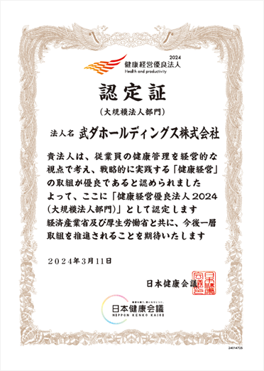 武ダホールディングスは、従業員の健康管理を経営的な視点で考え、戦略的に実践する「健康経営」の取組が優良であるとして、「健康経営優良法人2024(大規模法人部門)」に認定されました。