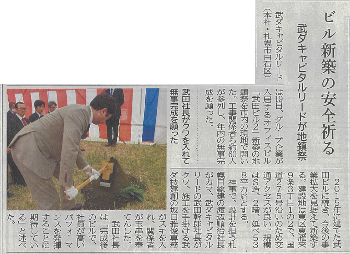グループ会社の武ダキャピタルリードが札幌市東区東雁来に新築するオフィスビル「武田ビル8」の地鎮祭を7月19日(金)に行いました。
