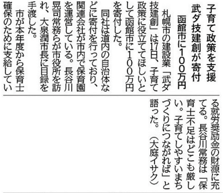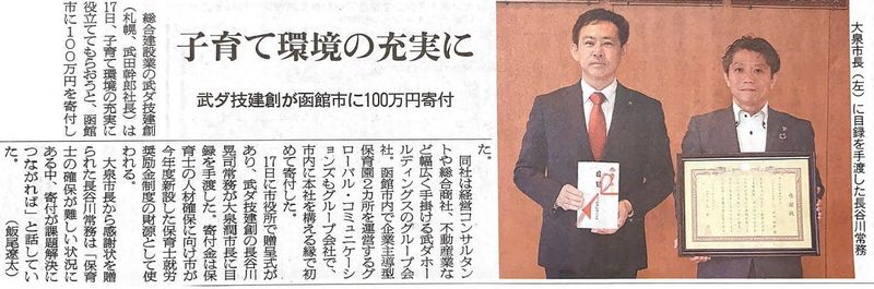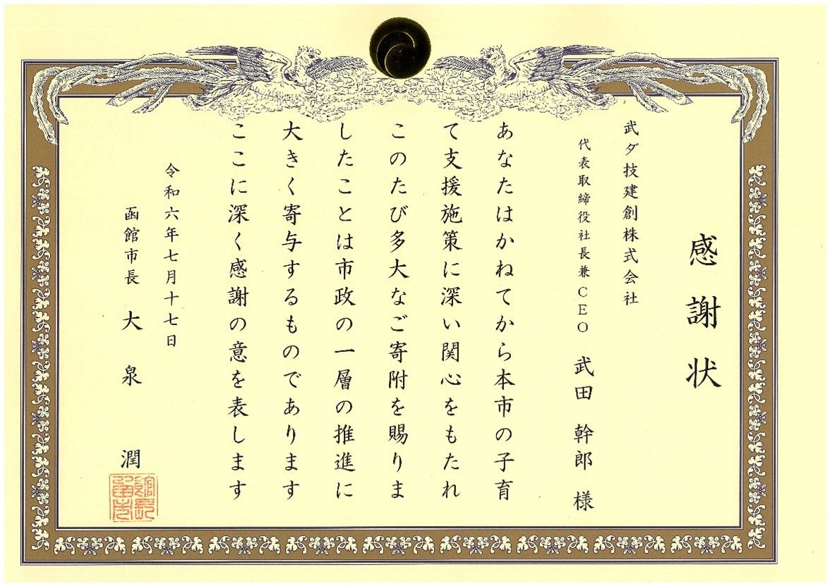 グループ会社の武ダ技建創は北海道函館市へ企業版ふるさと納税を行い、市政の一層の推進に貢献したとして感謝状をいただきました。寄付金は、安心して子どもを産み育てやすい環境づくりの一環として、保育士確保対策事業にご活用いただく予定です。