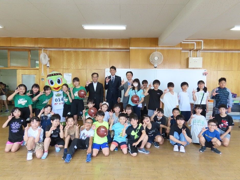 当日はレバンガ北海道代表取締役社長の折茂武彦様やレバンガ北海道の公式マスコットのレバード、そして札幌市立緑丘小学校の約40名の児童の皆さまにお集まりいただきました。