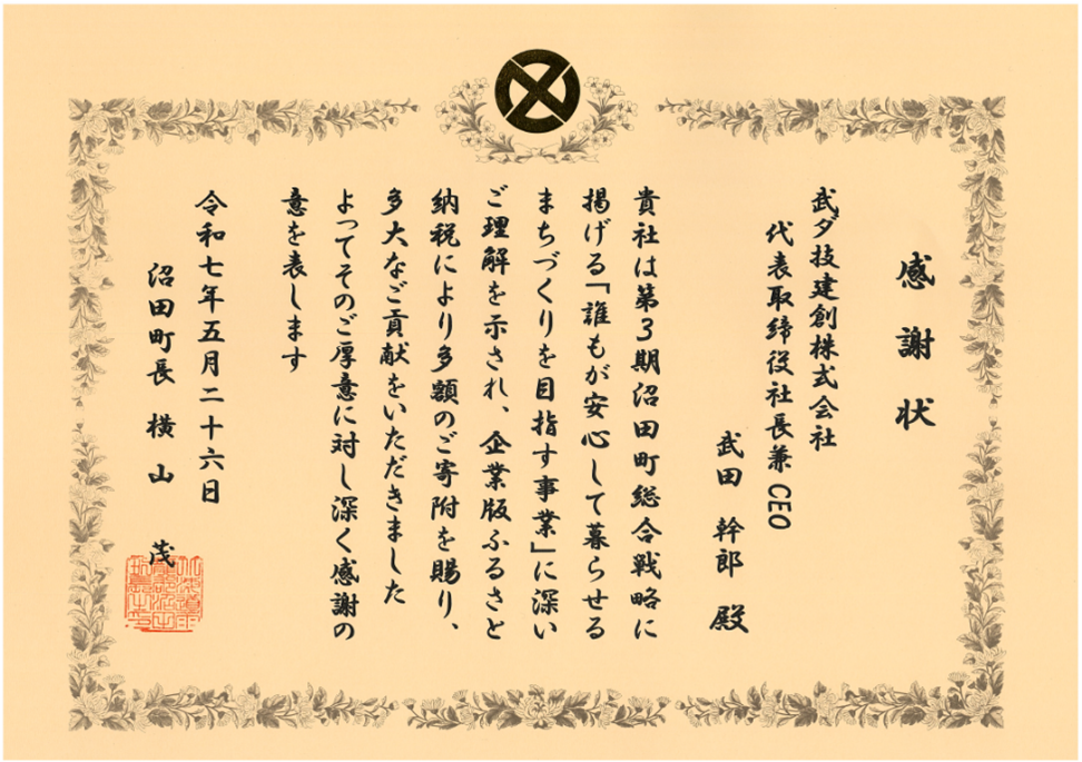 武ダGEADグループの武ダ技建創は北海道沼田町へ企業版ふるさと納税を行い、「誰もが安心して暮らせるまちづくりを目指す事業」に貢献したとして感謝状をいただきました。寄付金は、子育て医療費の無償化事業にご活用いただく予定です。