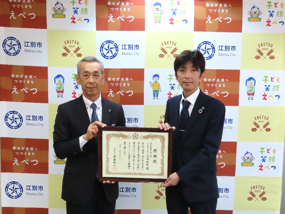 武ダGEADグループの武ダ技建創は北海道江別市へ企業版ふるさと納税を行い、市の地方創生事業に貢献したとして感謝状をいただきました。寄付金は、子どもを安心して産み育てられるまちを目指す江別市の「あそびのひろば事業」にご活用いただく予定です。