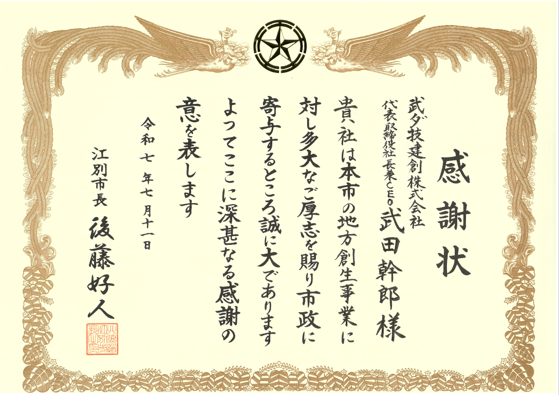 武ダGEADグループの武ダ技建創が江別市より感謝状を頂きました