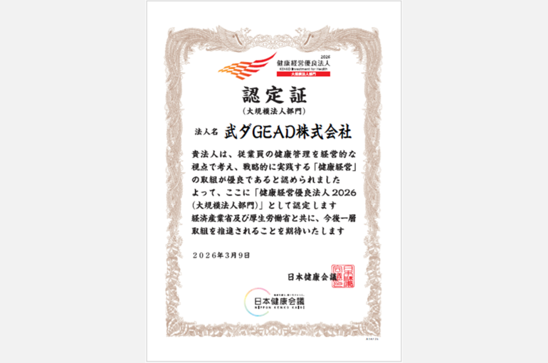 武ダGEADは、社員の健康管理を経営的な視点で考え、戦略的に実践する「健康経営」の取組が優良であるとして、4年連続で「健康経営優良法人2026(大規模法人部門)」に認定されました。